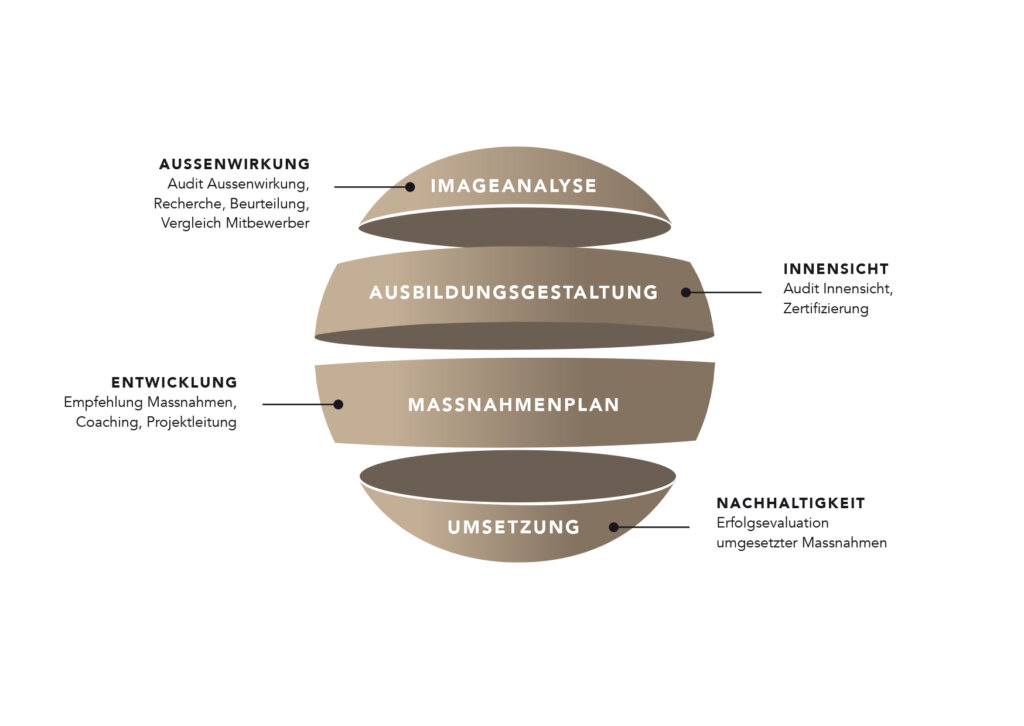 Bei der Begleitung von Ausbildungsbetrieben setzen wir einen ganzheitlichen Fokus. Jede*r Lernende und jede*r Mitarbeitende wird die einzelnen Phasen von der Rekrutierung bis zur Trennung vom Unternehmen durchlaufen. Massgeblich ist es, dass die Prozesse und Massnahmen in den einzelnen Phasen geplant und umgesetzt werden und der Erfolg stetig überprüft wird.